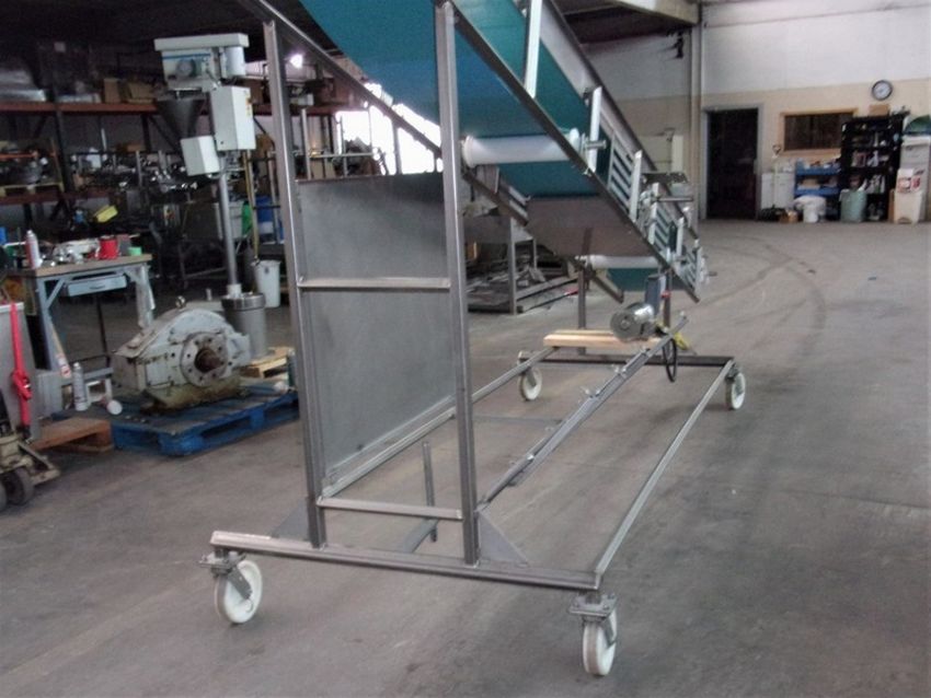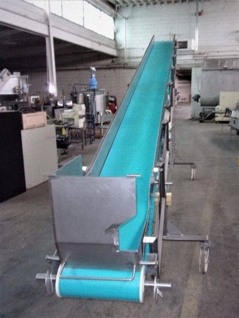 FPEC Mega Aprox. 16" W x 21 ft. L S/S Sanitary Blue Belt Incline Conveyor, S/N 1075038 - Conveyor 047 - Very expensive system new, Unit last used in the food industry and remains in like new condition, 5-1/2 Inch siderails ( runs the entire length of the conveyor), All Stainless Steel Portable on Casters, Hopper at the infeed measures 16 inches X 20 inches, Infeed height is 26 inches, Discharge height is 104 inches, 1 HP Stainless Steel Washdown Drive 208/230/460 Volt with start stop switch, Overall dimensions are 110 inches overall height X 21 ft in length X 53 inches wide, This system has a solid frame that can not be lowered for shipping common carrier without cutting the frame (This system will need to ship on a single drop flatbed) (Loading Fee $500) (Located Hortonville, WI)