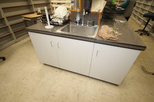 Lab Counter Island with Bottom Cabinets, with Tiled Top/Wood Bottom, Built in S/S Sink, Overall Dims.: Aprox. 22' L x 6' W x 3' H (Old Tag 100) (Located Wappingers Falls, NY)