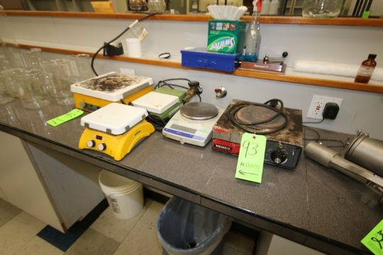 Assorted Lab Equipment, Includes (3) Thermo Scientific & Thermoline Hot Plates, (1) Mettler Toledo Scale, M/N PB2003-S (Old Tag 93) (NOTE: THERE ARE ONLY (4) HOT PLATES AVAILABLE -- THE PLATED SHOWN IN THE PHOTO IN FRONT OF THE (4) IS NO LONGER AVAILABLE) (Located Wappingers Falls, NY)