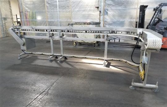 Aprox. 8" W x 16' L S/S Sanitary Intralox Conveyor with 90 Degree Turn, 1/2 hp Drive, 208/230/460 V, Electric Eye, Infeed and discharge height is 45 inches. This is adjustable with foot pads, 2 Inch siderails the entire length of the conveyor -- This system was last used in a Tyson Foods Plant and just removed from service. System is in excellent working condition. This system should ship flatbed. Not sure we can get a common carrier to take this due to the length of the unit. (Loading Fee $250) (Located Hortonville, WI)