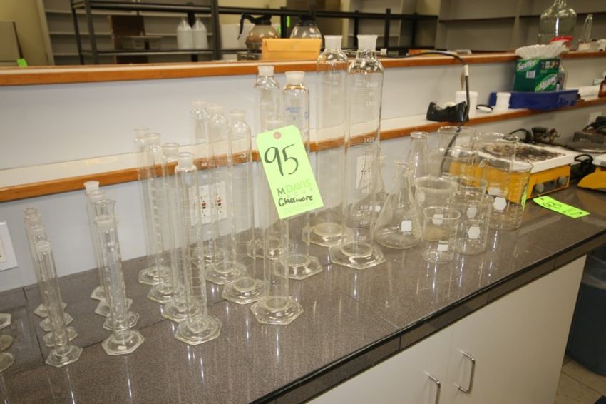 Assorted Lab Glassware, Approx. 45 pcs, Includes Graduated Cylinders, Beakers, Beakers, and Other Present Glassware (Old Tag 95) (Located Wappingers Falls, NY)