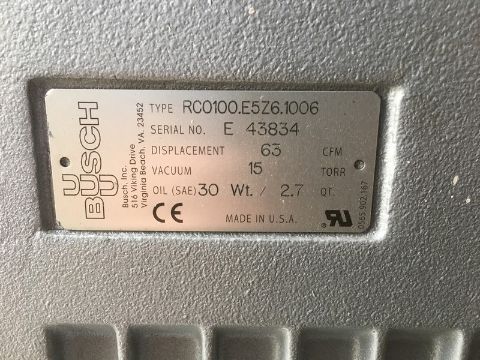 Busch 5 hp Vacuum System, Model D-6088, Drawing C-3276, with Toshiba 5 hp High Efficiency Motor, 1735 RPM, 3-60 Phase, 230/460 , Busch Type R0100.E5Z6.1006, S/N E43834 - 15 Vacuum, 63 CFM, Oil (SAE) 30 Wt Airtech Vacuum Pump (Located Carson City, NV)