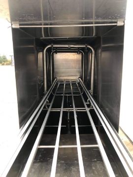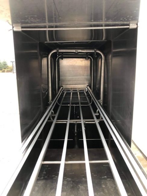 Manual Hoop Washer, Reconditioned by Ullmer's Fabrication with 1-1/2" Spray Nozzle, (3) Removal Push Doors, Removal Top Cover, 2 hp Pump, 230/460 V, 1750 RPM, 3 Phase; 7.5 hp Pump, 230/460 V, 3450 RPM, 3 Phase, 1" Overflow Pipe, Inlets (5) 1-1/2", (1) 2", (3) 3", (2) 4", Outlets (1) 1-1/2" and (1) 2", Inside Dimensions Aprox. 71" L x 16" W x 55" Deep, Overall Dimensions Aprox. 133"L x 30" W x 72-1/2" H (Unit #3335) (Prep Fee $500) (Located Pulaski, WI)