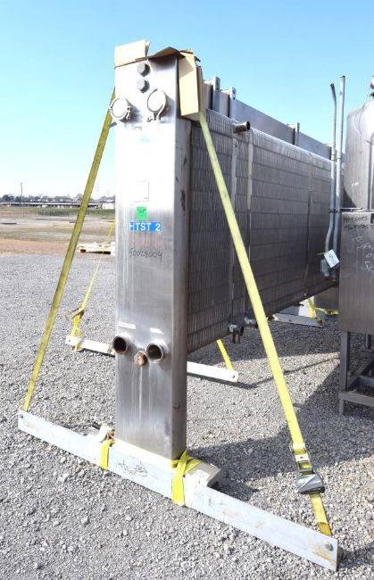 Used- APV Plate Heat Exchanger, Model R51TH#11. Approximately 3000 square feet. (566) 16-1/2" wide x 60" tall 316 stainless steel plates, working pressure 200 psig. 4" Inlet & outlets. Includes (2) spacers with 2-1/2" tri-clamp inlets and outlets, (1) Spacer with 2" Tri-Clamp Inlets and Outlets, Expandable 304 S/S Frame, S/N 20003003000545, Built 2000 (Loading Fee $300) (Located Memphis, TN)
