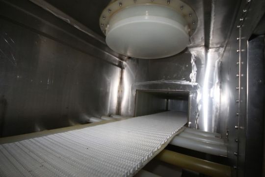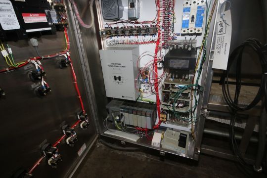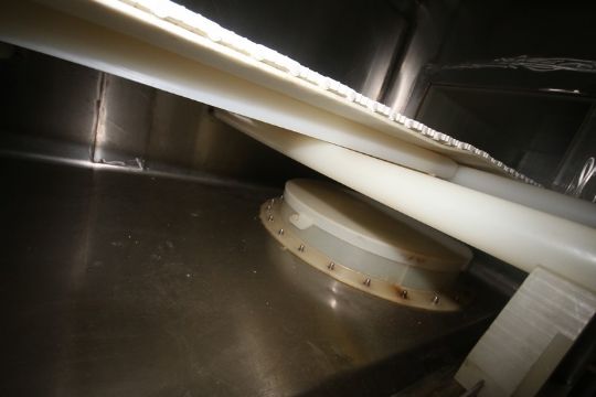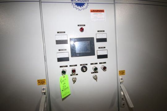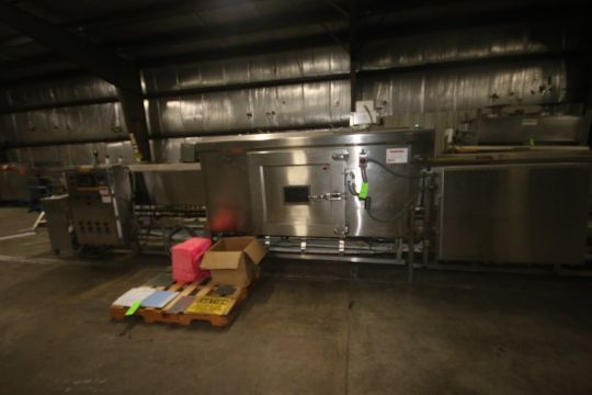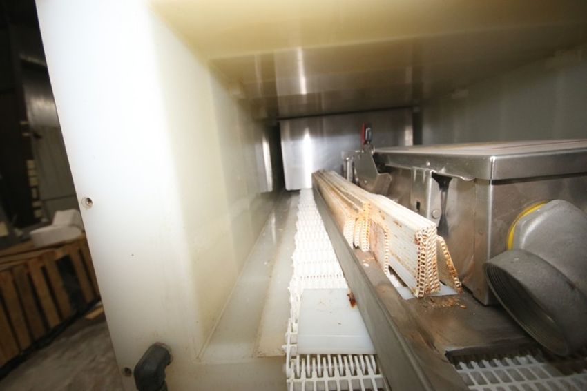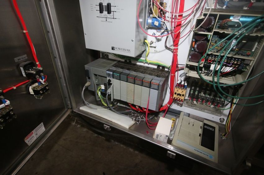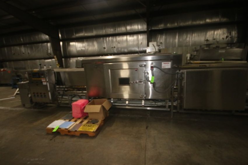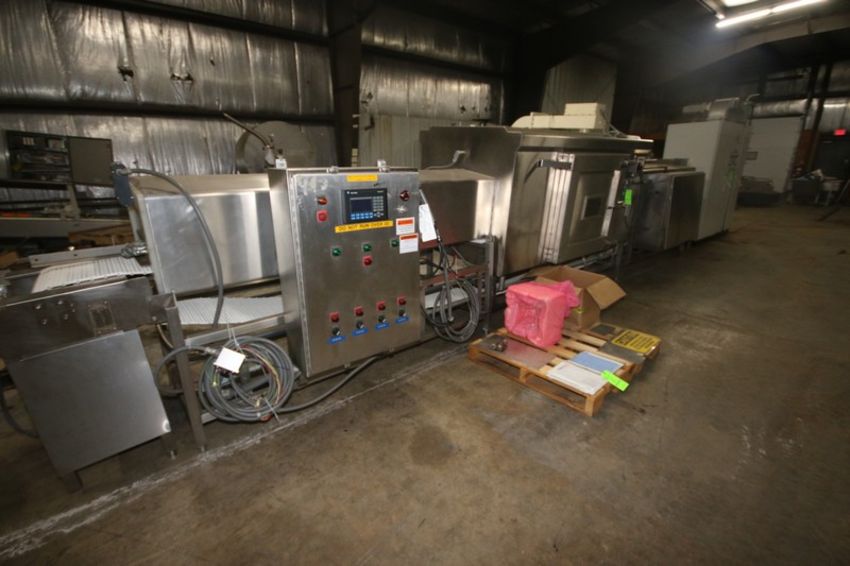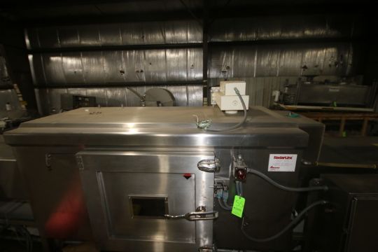 Amana RadarLine S/S Industrial Microwave, M/N QMP 1679, S/N A0120, with Aprox. 19" Plastic Interlock Belt, with Allen-Bradley 7-Slot PLC with 2-Door Control Cabinet, with Allen-Bradley 10-Slot PLC, Control Panel Containing Some Microwave Components (NOTE: PLC is Missing 1-Slot--See Photographs)(LOCATED IN APPLETON, WI) (Rigging, Handling, & Site Management Fee: $3,000.00 USD)