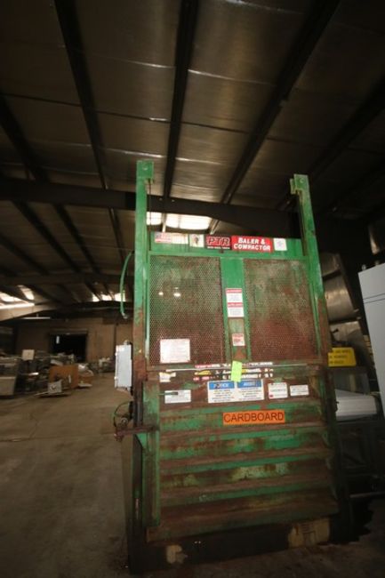 PTR Vertical Hydraulic Baler, with 10 hp Hydraulic Unit, with 23 Gal. Tank Capacity, with WEG Drive, 10.5 GPM Pump Capcity, 460 Volts, 3 Phase, Overall Dims.: Aprox. 81" L x 49" W x 142" H (NOTE: Hydraulic Unit is Uninstalled from Top of Unit--See Photographs)(LOCATED IN APPLETON, WI) (Rigging, Handling, & Site Management Fee: $500.00 USD--Includes Laid Down & Skidded)