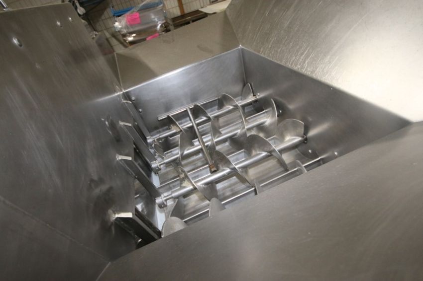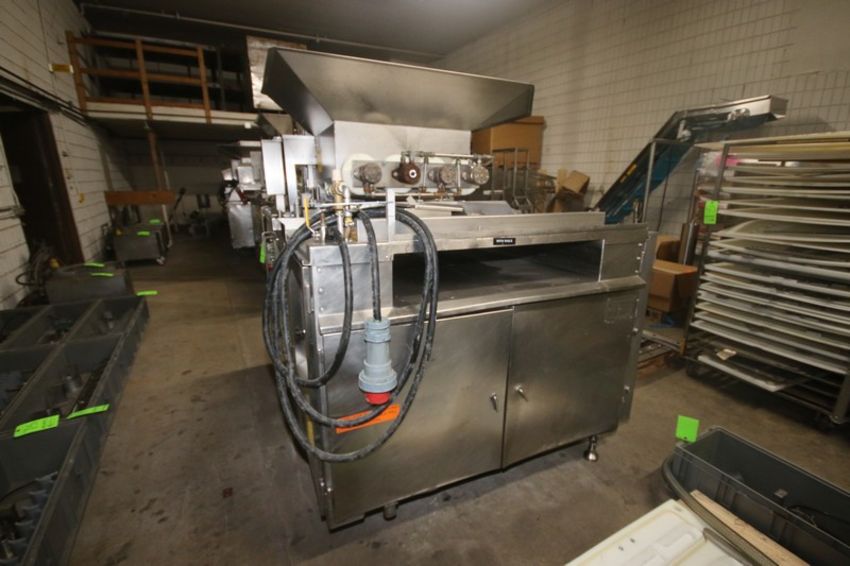 Tetra Laval Food Koppens Molder, Type 400-52, S/N 900 HS/E/T-95, 440 Volts, 3 Phase, with (4) S/S Augers, with S/S Infeed Funnel with Tilt Capability, with Hold Head in Bin, Mounted on S/S Frame (LOCATED IN APPLETON, WI) (Rigging, Handling, & Site Management Fee: $1,000.00 USD)