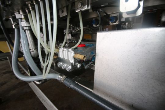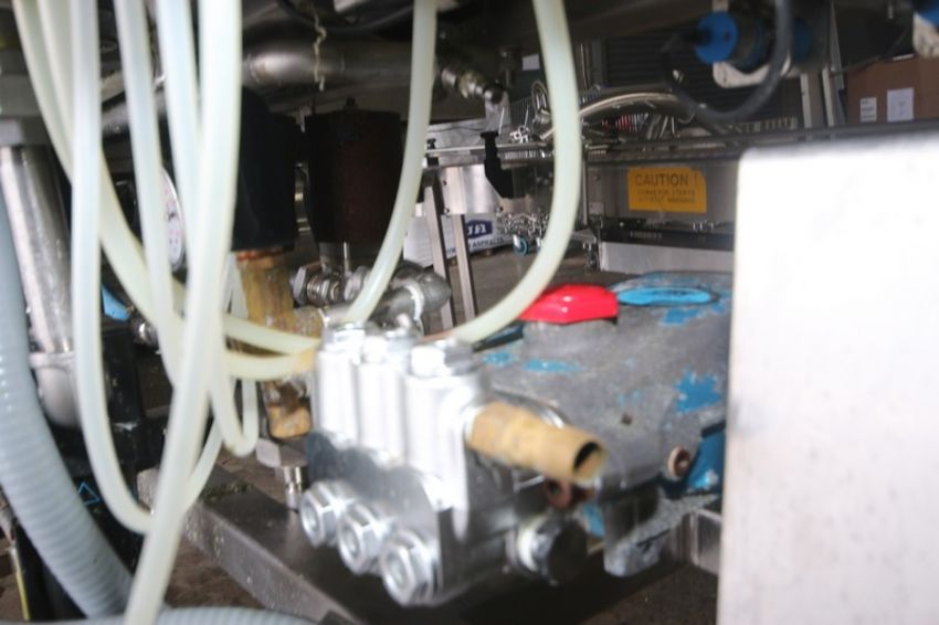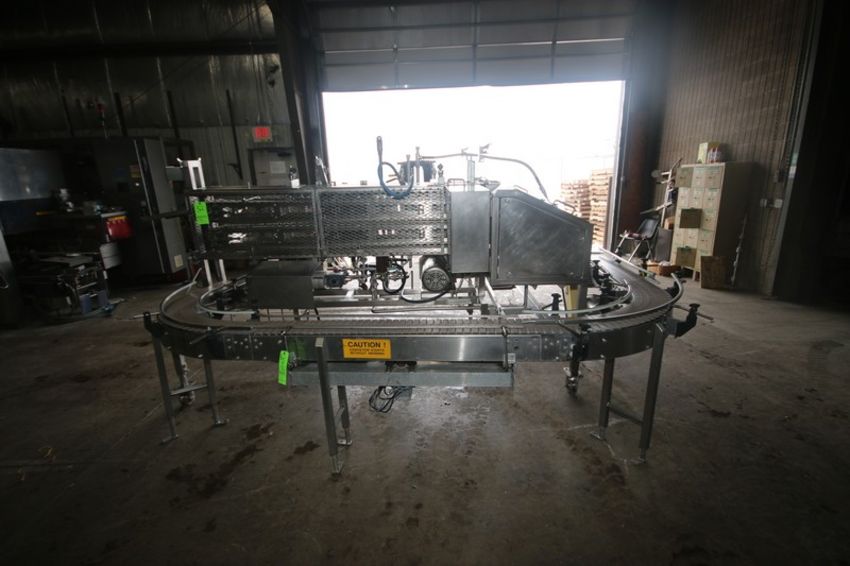 S/S Zucchini Stick Cutting Machine, with Double Tier Discharge Conveyor, with Aprox. 5" W Belt, with "U" Shape S/S Product Conveyor, with Aprox. 7-1/2" W Plastic Belt, with S/S Clad Drive, with CAT High Pressure Pump Head, Mounted on S/S Portable Frame (2-Pce. Lot) (LOCATED IN APPLETON, WI) (Rigging, Handling, & Site Management Fee: $750.00 USD)