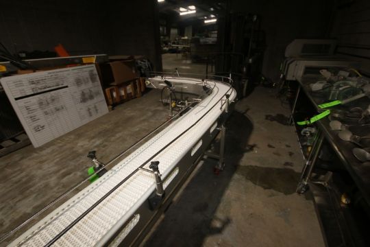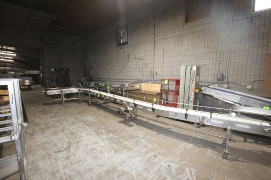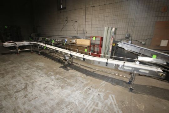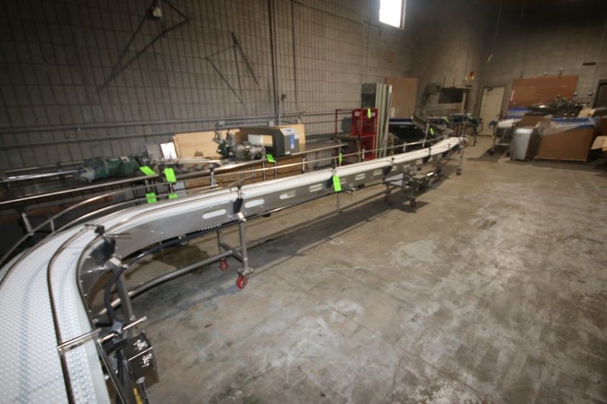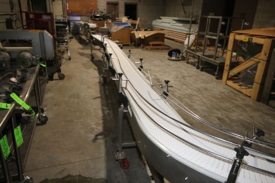 Curve S/S Conveyor, with (1) 90 Degree Turn, with (1) S/S Clad Motor, with Aprox. 12" W Plastic Interlock Belt, with S/S Guide Rails, Mounted on S/S Portable Frame (LOCATED IN APPLETON, WI) (Rigging, Handling, & Site Management Fee: $200.00 USD--Dry Van Ok for Transportion)