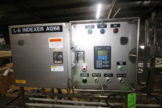 Custom S/S Indexer, with Aprox. 12" W Belt with Flights, Flight Spacing Aprox. 16", with Allen-Bradley PanelView 300, with Allen-Bradley Micro-Logix 1000 PLC, Mounted on S/S Portable Frame (NOTE: Missing Belt)(LOCATED IN APPLETON, WI) (Rigging, Handling, & Site Management Fee: $200.00 USD)