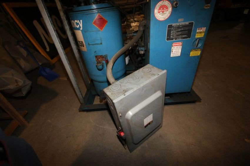 Quincy 75 hp Air Compressor, M/N Q350, S/N SI03WNW3LD 3545, with Square D Safety Switch, Mounted on Skid (LOCATED IN GRAND ISLAND, NE) (Rigging, Handling, & Site Management Fee: $325.00 USD)