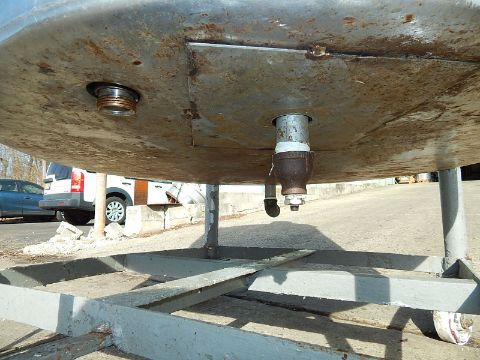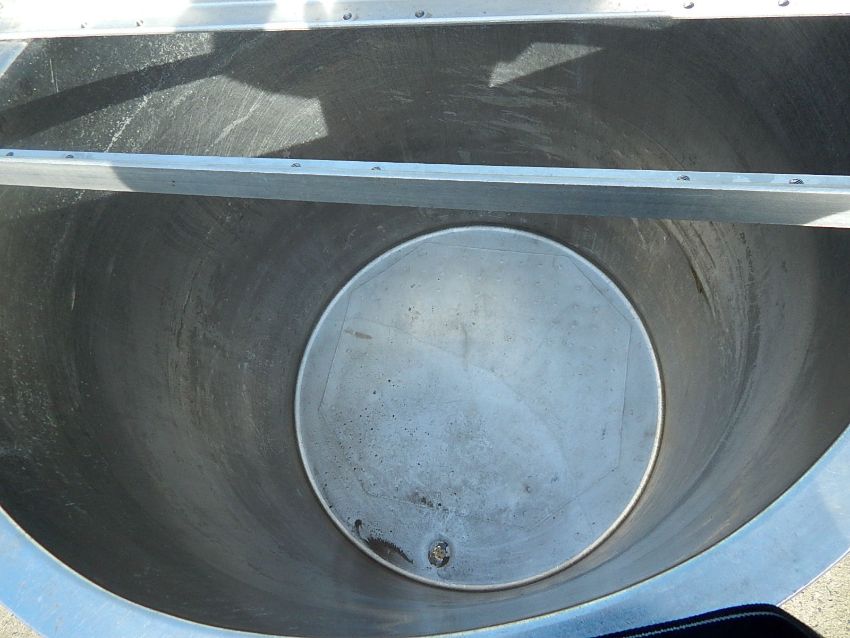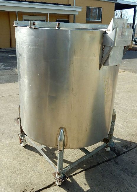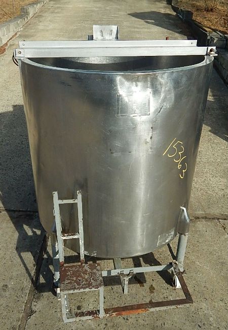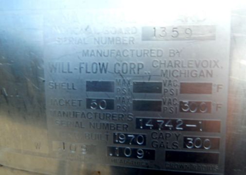300 GALLON OPEN TOP JACKETED STAINLESS STEEL SANITARY MIXING TANK BY WILL FLOW CORP. SERIAL # 14742-1. FEATURES HALF JACKETED SIDE WALL AND BOTTOM, NATIONAL BOARD RATED (# 1359) FOR 50 PSI @ 300 DEGREES F, FULLY SHROUDED BODY WITH POLISHED FINISH, 43" DIAMETER X 45" DEEP WITH FLAT SLOPPED BOTTOM TO 1.5" DISCHARGE WITH ACME THREADED BEVEL SEAT CONNECTION AND 18" FLOOR CLEARANCE, 12" WIDE SS ANGLE IRON BRIDGE SUITABLE FOR MIXER MOUNTING, EXTERNAL MOUNT FOR CLAMP TYPE MIXER, VESSEL MOUNTED ON FOUR PAINTED STEEL PIPE LEGS FROM HIP SOCKETS WITH INTERCONNECTED FRAME AND STEP PLATFORM FOR TANK ACCESS.