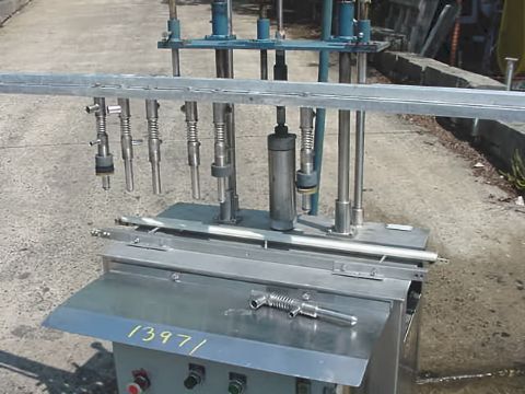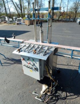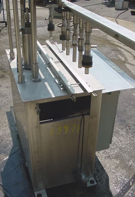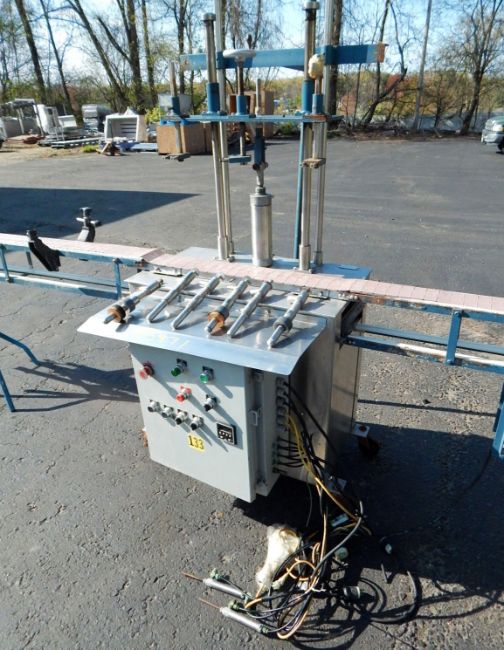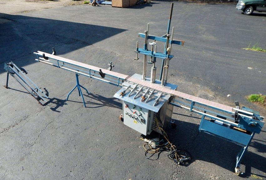 SIX STATION IN LINE PRESSURE GRAVITY FILLER BY PERL MACHINERY SERIAL # 99189. FEATURES ALL STAINLESS STEEL FRAME, PORTABLE WITH 18' LONG x 4" WIDE DELRIN TABLE TOP CHAIN CONVEYOR WITH 3/4 HORSEPOWER, 115 VOLT AC DRIVE WITH GEAR REDUCER, EQUIPPED WITH SIX- 7/8" DIAMETER PRESSURE GRAVITY STYLE FILLING NOZZLES, PNEUMATIC GATING SYSTEM FOR AUTOMATIC OPERATION. INCLUDES ORIGINAL FACTORY CONTROLS (115 VOLT/1 PHASE)