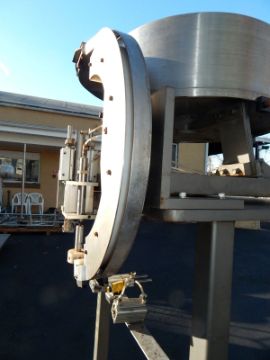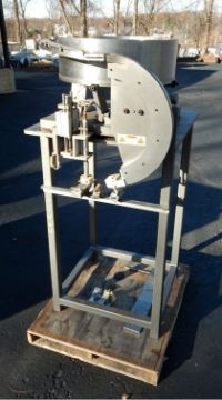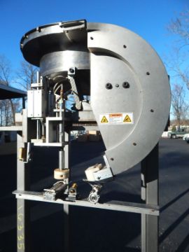 CUSTOM BUILT IN LINE SINGLE STATION CAPPER, UNIT IS DESIGNED TO RECIEVE CONVEYORIZED CONTAINERS WITH CAPS BEING STRIPPED FROM FIXED CAP CHUTE (SHOWN AT 50" FLOOR HEIGHT) AND TIGHTENED WITH PNEUMATICALLY OPERATED CHUCK FOR 38 MM PILFER PROOF SCREW CAPS, CONTAINER INDEXING AND GATING STATIONS ON MOVEABLE MOUNTINGS, STAINLESS STEEL 28" DIAMETER BOWL FEEDER WITH FIXED CAP CHUTE IS DRIVEN BY VIBVO ECCENTRIC 570 PNEUMATIC VIBRATOR, CONTROLS REQUIRED (ORIGONAL BANNER SENSORS ARE STILL MOUNTED IN SYSTEM), HEAVY DUTY PAINTED STEEL FRAME WITH THREADED LEVELING FEET. FORMERLY USED IN FOOD INGREDENTS FOR GALLON AND LARGER CONTAINERS. SEE VIDEO TESTING BOWL FEEDER PRIOR TO MACHINE ASSEMBLY ON OUR YOUTUBE CHANNEL https://youtu.be/pJYtoNIn8ek