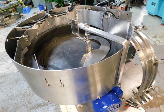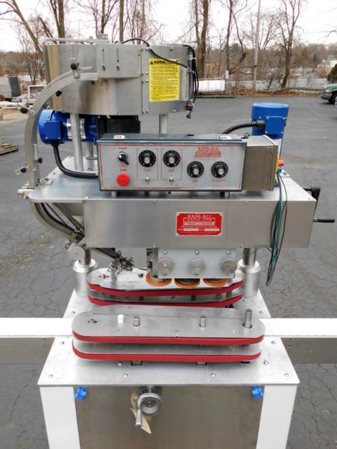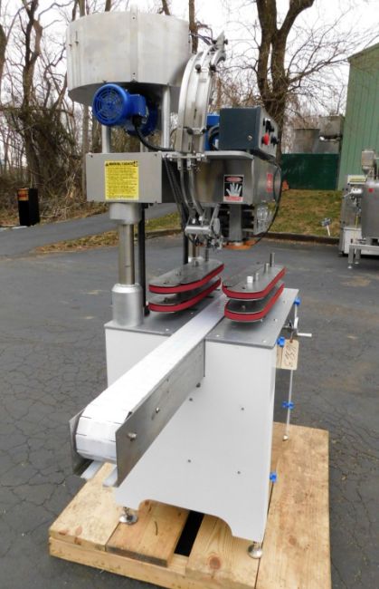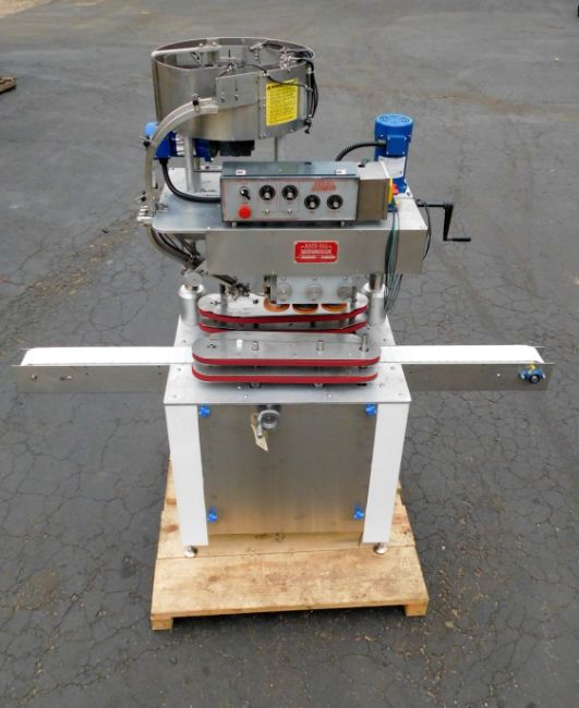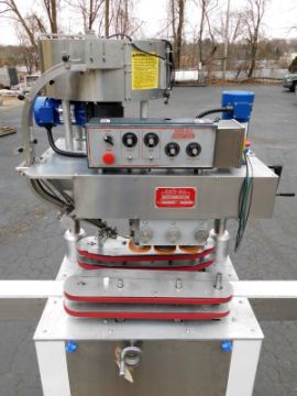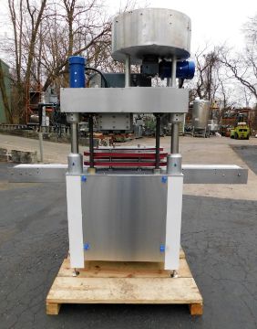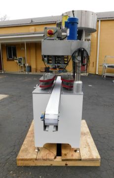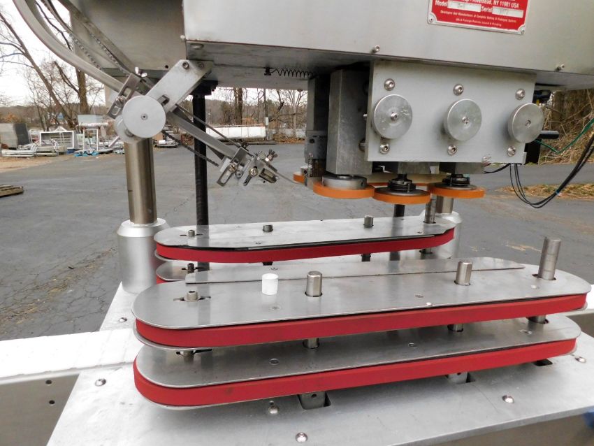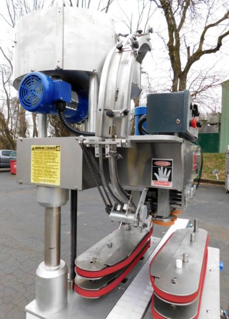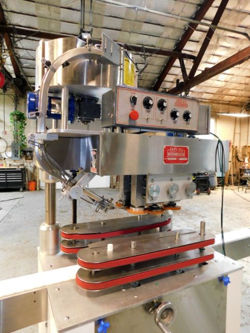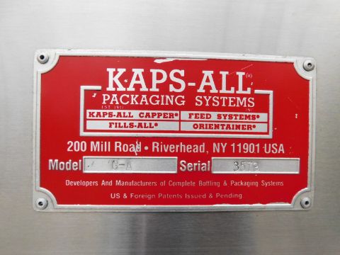 KAPS-ALL FULLY AUTOMATIC CAPPER MODEL G-A, SERIAL # 3579. FEATURES MANUFACTURERS RATING FOR 150 BPM @ 13-70 MM CAPS, SIX QUILL TIGHTEN WITH CLUTCH EQUIPPED TIGHTENING QUILLS AT LAST FOUR STATIONS FOR TORQUE CONTROL, 24" DIAMETER CENTRIFUGICAL CAP SORTER, ADJUSTABLE CAP CHUTE, TWIN CONTAINER STABILIZING BELTS, CABINET STYLE BASE WITH OPPOSING SS SERVICE DOORS, 4.5" WIDE X 7' LONG CONVEYOR WITH WHITE DELRIN TABLE TOP CHAIN, 220/3 PHASE VOLTAGE OPERATING ALL DRIVES ON 180 VOLT DC WITH VARIABLE SPEED ON ALL FUNCTIONS, THREADED LEVELING FEET, FACTORY CONTROLS. SEE VIDEO ON YOUTUBE AT https://youtu.be/V2XzDrfGgCI