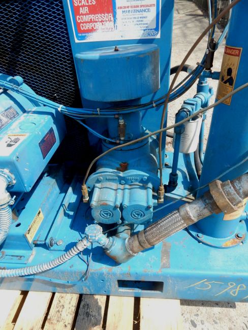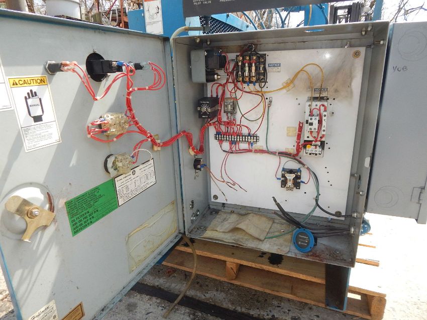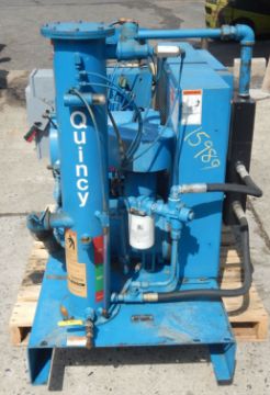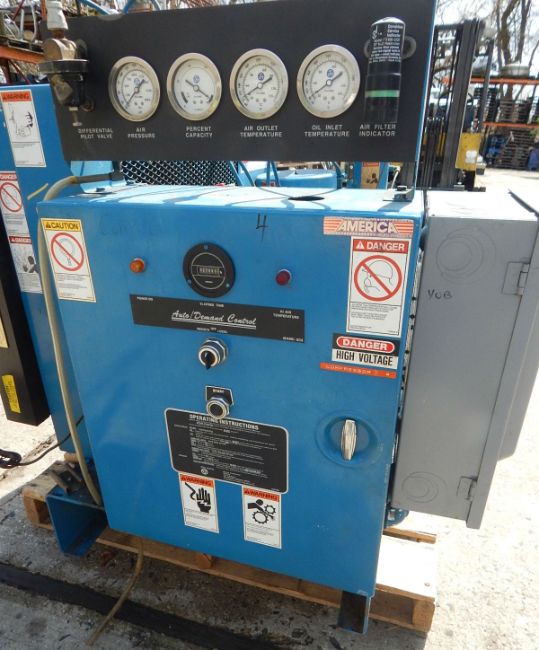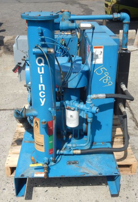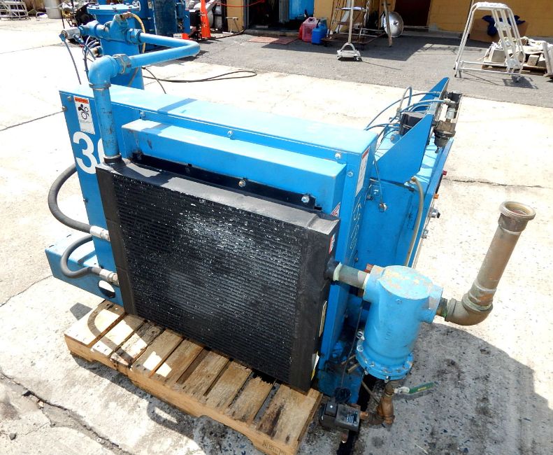 ROTARY SCREW AIR COMPRESSOR BY QUINCY, SERIAL # 90634 0SBGANA311. FEATURES 30 HORSEPOWER DRIVE BY GE BELT DRIVING COMPRESSOR @ 1770 RPM, 200-230/460/3 PHASE VOLTAGE, MANUFACTURER RATES PERFORMANCE AT 110 CFM AND WILL PRODUCE PRESSURES UP TO 125 PSI, FLOOR SKID MOUNTED WITH FORK LIFTING SLOTS, OIL TANK WITH RECIRCULATING COOLER, FACTORY CONTROLS WITH ANALOG GAUGES FOR AIR PRESSURE, PERCENT OF CAPACITY, AIR OUTLET TEMPERATURE, OIL INLET TEMPERATURE, POWER INDICATOR AND HIGH AIR TEMPERATURE WARNING LIGHTS, LOCAL AND REMOTE OPERATION SWITCH, START BUTTON, UNIT IS PRESENTLY WIRED FOR 460 VOLT SERVICE, ESTIMATED USE HOURS 50,000.