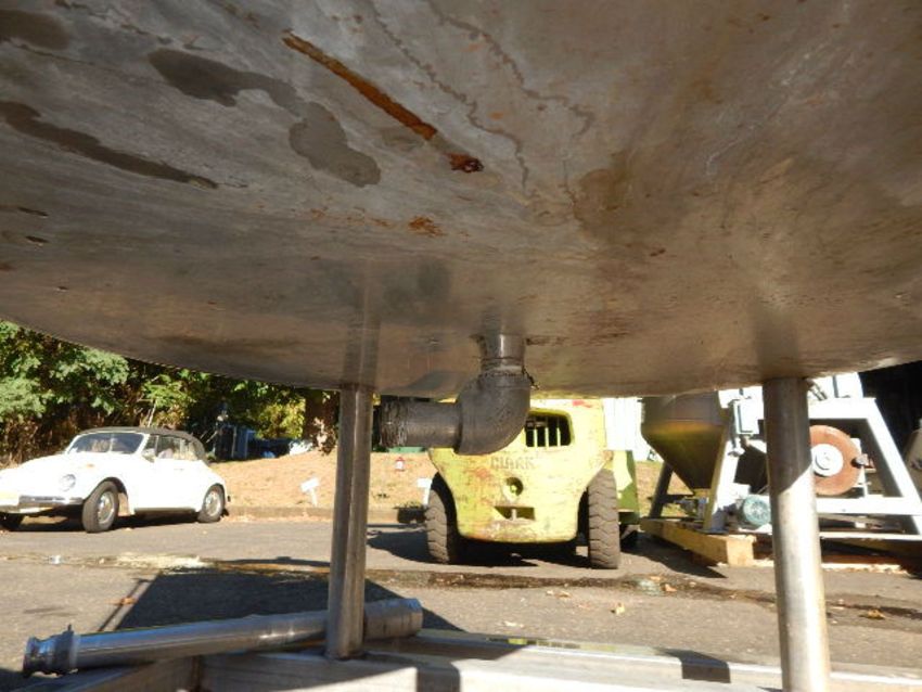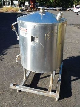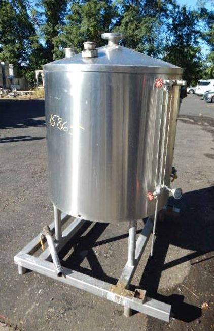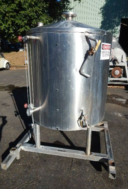 200  GALLON CLOSED VACUUM RECEIVER TANK BY PERRY PRODUCTS, MODEL 200 GAL VDW, SERIAL # A55921. FEATURES ALL STAINLESS STEEL CONSTRUCTION, RATED FOR FULL VACUUM SERVICE @ 200° F, APX 42" DIAMETER x 38" STRAIGHT SIDE WITH DISH TOP AND BOTTOM, FULLY SHROUDED BODY WITH COPPERCOIL INSIDE, 1.5" CENTER BOTTOM DISCHARGE WITH MALE NPT CONNECTION AND 14" FLOOR CLEARANCE, CONE TOP WITH 3 INLETS (2" W/NPT 1/2 UNION, 4" W/TRI CLAMP AND 3" TOP CENTER WITH FOUR BOLT FLANGE),  SIDE SIGHT GLASS.