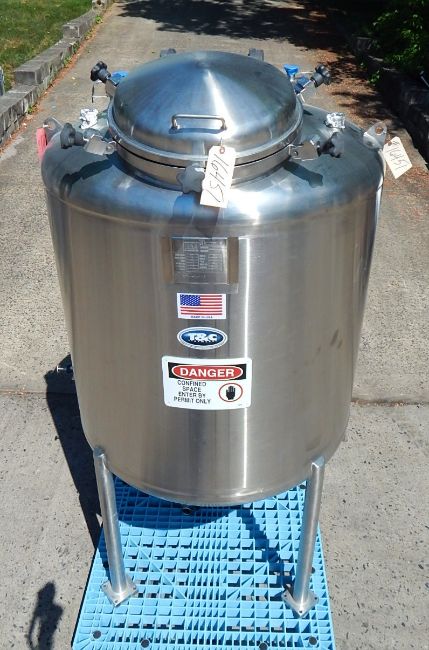250 GALLON PHARMACEUTICAL GRADE PROCESS TANK BY T & C STAINLESS (MT. VERNON, MO), SERIAL # TC 6637-1. FEATURES ALL 316L STAINLESS STEEL CONSTRUCTION WITH POLISHED FINISH, NATIONAL BOARD RATED (# 767) VESSEL SHELL FOR 60 PSIG @ -20 TO 350 DEGREES F, VESSEL MAEWP 15 @ 350 DEGREES F, DISHED HEADS IN 1/4" THICKNESS WITH 7 GAUGE SHELL, 18" DIAMETER MANWAY WITH HINGED DOME COVER AND SIX HANDWHEEL OPERATED SCREW DOWN CLOSURES, 6-1.5" AND 2-3" TOP PORTS ALL WITH TRI CLAMP CONNECTIONS, 3" PORTS ARE EQUIPED WITH 2.5" DIAMETER ROUND SPRAY BALLS, ONE 1.5" PORT HAS INTERNAL SIDE WALL SPILL TUBE, VESSEL IS 42" ID X 38" STRAIGHT WALL, DUAL TOP LIFTING LUGS, CENTER BOTTOM 1.5" OUTLET WITH TRI CLAMP CONNECTION AND 22" FLOOR CLEARANCE, MOUNTED ON FOUR LEGS WITH WEIGH CELL COMPATIBLE MOUNTING PADS 4.5" X 4.5" X 1" THICKNESS, OAD 82" HIGH X 46.5" DIAMETER.