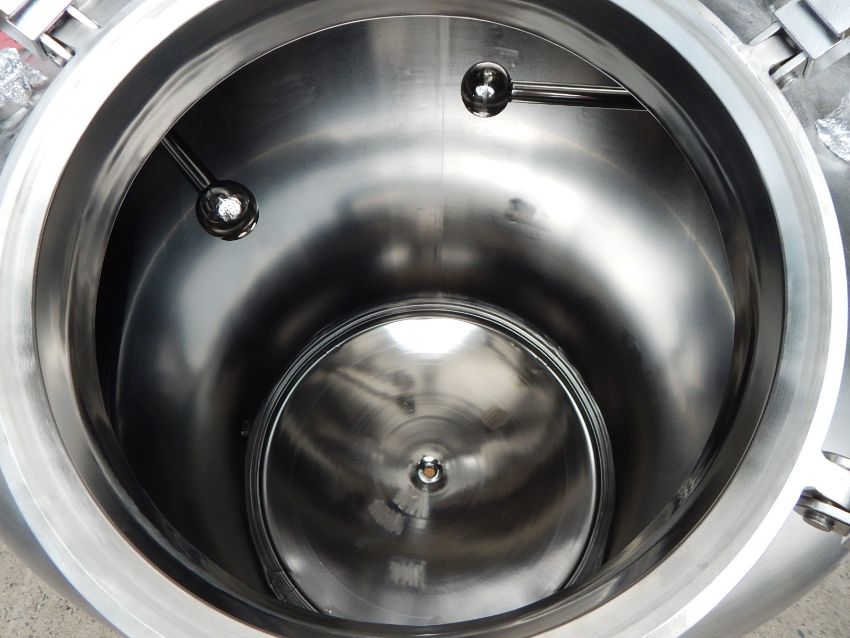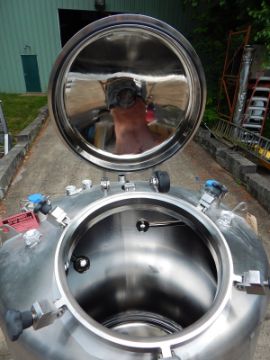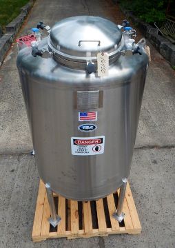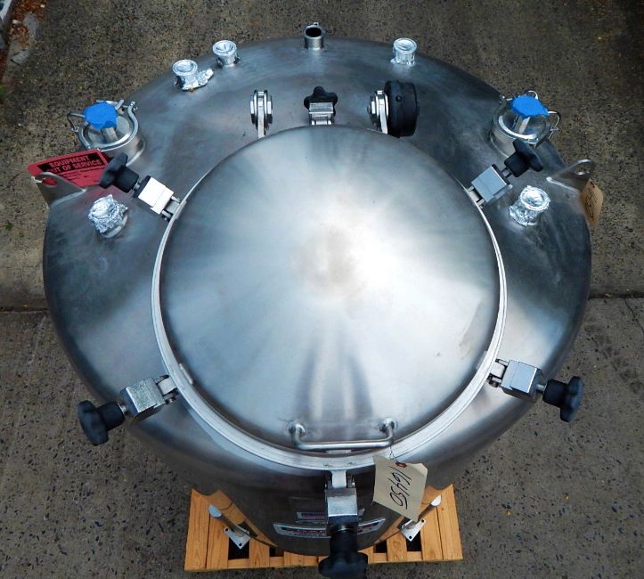 300 GALLON PHARMACEUTICAL GRADE PROCESS TANK BY T & C STAINLESS (MT. VERNON, MO), SERIAL # TC 6638-2. FEATURES ALL 316L STAINLESS STEEL CONSTRUCTION WITH POLISHED FINISH, NATIONAL BOARD RATED (# 770) VESSEL SHELL FOR 60 PSIG @ -20 TO 350 DEGREES F, VESSEL MAEWP 15 @ 350 DEGREES F, DISHED HEADS IN 1/4" THICKNESS WITH 7 GAUGE SHELL, 18" DIAMETER MANWAY WITH HINGED DOME COVER AND SIX HANDWHEEL OPERATED SCREW DOWN CLOSURES, 6-1.5" AND 2-3" TOP PORTS ALL WITH TRI CLAMP CONNECTIONS, 3" PORTS ARE EQUIPED WITH 2.5" DIAMETER ROUND SPRAY BALLS, ONE 1.5" PORT HAS INTERNAL SIDE WALL SPILL TUBE, VESSEL IS 42" ID X 46" STRAIGHT WALL, DUAL TOP LIFTING LUGS, CENTER BOTTOM 1.5" OUTLET WITH TRI CLAMP CONNECTION AND 15" FLOOR CLEARANCE, MOUNTED ON FOUR LEGS WITH WEIGH CELL COMPATIBLE MOUNTING PADS 4.5" X 4.5" X 1" THICKNESS, OAD 84" HIGH X 46.5" DIAMETER.