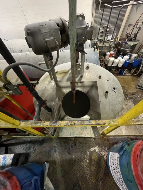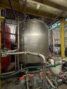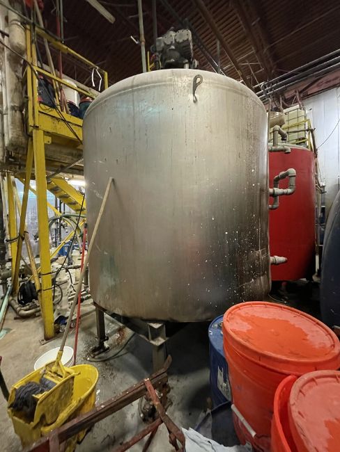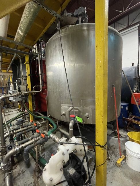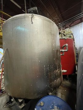 1,750 S/S JACKETED MIXING KETTLE WITH TOP MOUNT AGITATION, APPROX. 84" W X 84" STRAIGHT WALL, 132" TO TOP OF MIXER (JACKET PATCHED)