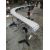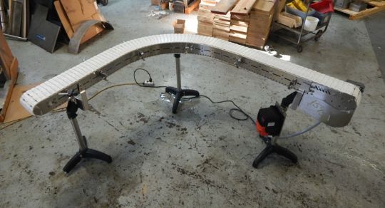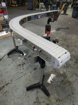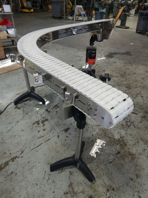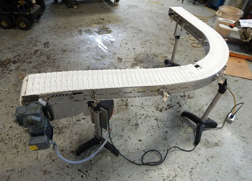ALL STAINLESS STEEL TABLE TOP CHAIN 90 DEGREE RIGHT TURN CONVEYOR, 7" WIDE WHITE TABLE TOP CHAIN WITH STRAIGHT 36" LONG INFEED, 90 DEGREE RIGHT TURN TO 36" LONG DISCHARGE WITH .75 HORSEPOWER SEW EURODRIVE AND GEAR REDUCER DRIVING CONVEYOR, NEMA 4X (INDOOR ONLY) AC FREQUENCY DRIVE ALLOWING 0-75 RPM CONVEYOR MOTOR SPEED, 110 VOLT/1 PHASE/4.3 AMP, FOWARD AND REVERSE, DIGITAL DISPLAY, MOUNTED ON SS LEGS WITH TRI POD BASES. 5' X 80" FOOTPRINT.