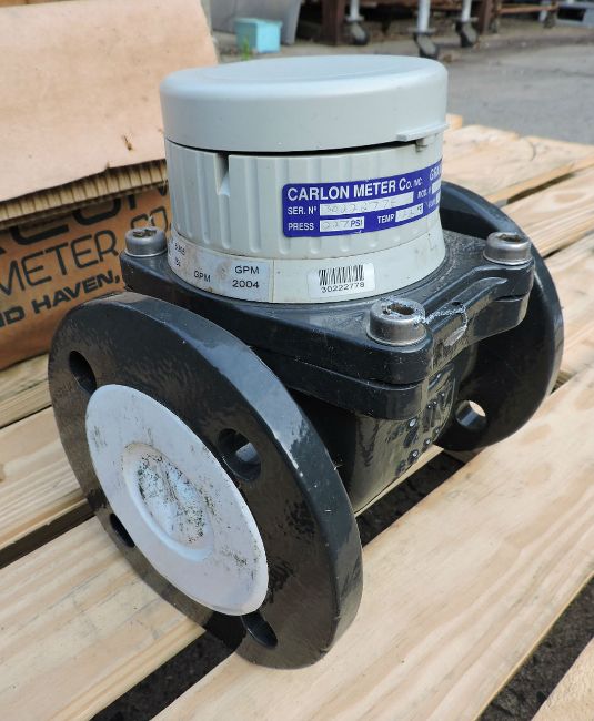 UNUSED INLINE FLOW METER BY CARLTON METER COMPANY (GRAND HAVEN MI.) MODEL C-200 EC, SERIAL # 30222778. FEATURES 2" FLOW THROUGH SIZE 6.5" OD FOUR BOLT FLANGED CONNECTIONS, EPOXY COATED STEEL BODY, RATED FOR 154 GPM FLOW @ 227 PSI MAXIMUM AND UP TO 122° F, 100 GPC, TOP READOUT (6 DIGIT) WITH HINGED PLASTIC COVER, FLOW READ DIALS IN 1/10ths, GALLONS AND GALLONS x 10, TOTAL LENGTH 7.750"