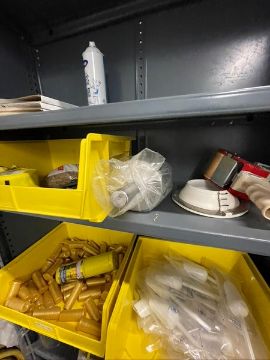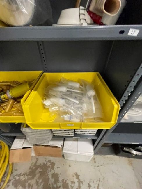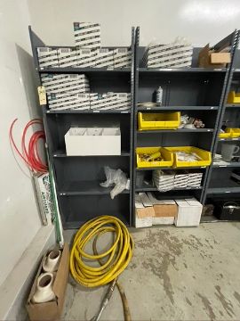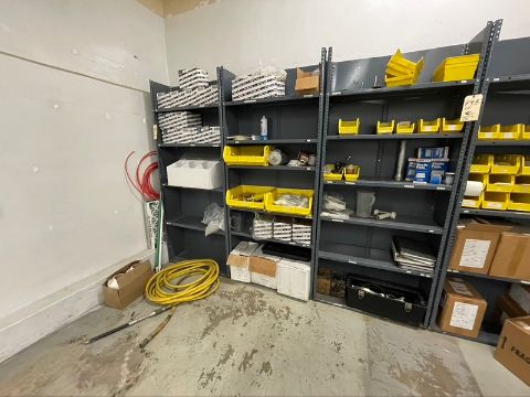 CONTENTS OF SHELVES, INCLUDING WHIRL-PAK BAGS, SAMPLE VILES, SCOOPS, HOSES AND MORE (DOES NOT INCLUDE BOXES OF DFA TICKETS ON BOTTOM-RIGHT) (RIGGING, SITE MANAGEMENT AND LOADING FEE $20.00) (DOES NOT INCLUDE PACKAGING, SKIDDING, PALLETIZING, CRIBBING, CRATING, ETC.)
