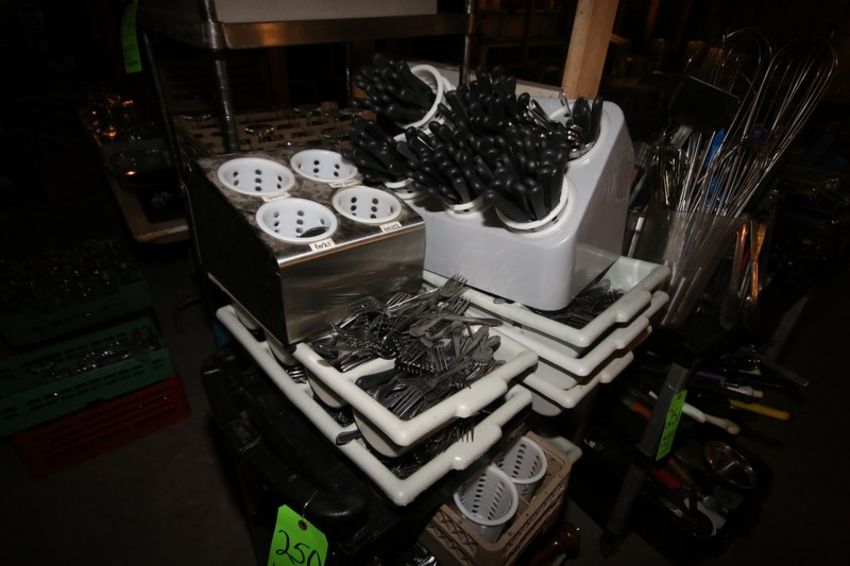 Plastic Cart of S/S Silverware & Misc., Includes Forks, Steak Knives, Butter Knives, Spoons, Wooden Pepper Shakers, Plastic Bins & Silverware Dispenser (Located in Adamstown, PA--New Roof Warehouse) (Rigging, Loading & Site Management Fee: $10.00 USD)