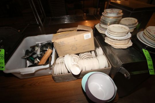 Lot of Assorted Fine Plates, Utensels, and Other Misc., with Folding Table (Located in Adamstown, PA--New Roof Warehouse)