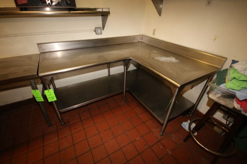 S/S Corner Table, Overall Dims.: Aprox. 72" L x 60" W x 34" H, Includes S/S Bottom Shelf, with S/S Back Splash & Round Edges (Located in Adamstown, PA--Restaurant Kitchen) (Rigging, Loading & Site Management Fee: $25.00 USD)