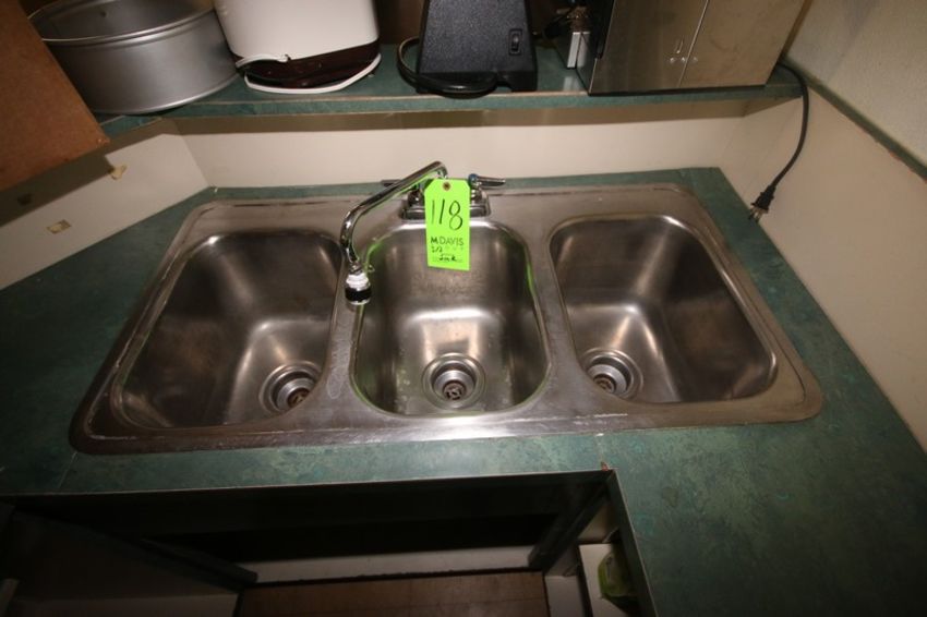S/S Triple Bowl Sink, Counter Mounted, Overall Dims.: Aprox. 37" L x 19-1/2" W x 12" H (Located in McMurray, PA) (Rigging, Loading & Site Management Fee: $10.00 USD)