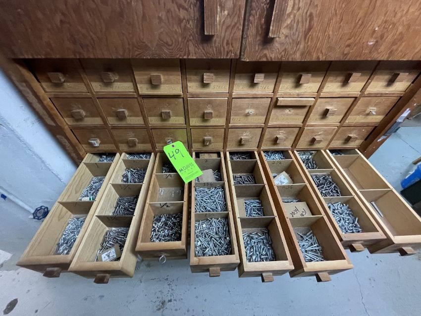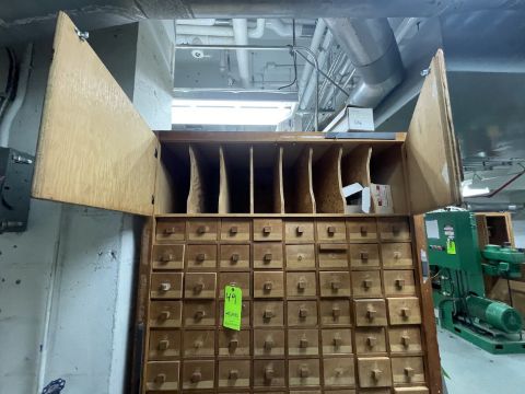 WOODEN HARDWARE CABINET (HISTORIC ITEM - MADE IN SHOP - 96 SMALL COMPARTMENTS, 2 LARGE), INCLUDES SCREWS, BOLTS, FASTENERS AND ASSORTED HARDWARE CONTENTS (SEE PHOTOS FOR CONTENTS), APPX DIMENSIONS OF CABINET 48''L x 22'W' x 78''H (Non-Negotiable Rigging, Packaging and Loading Fee: $25)