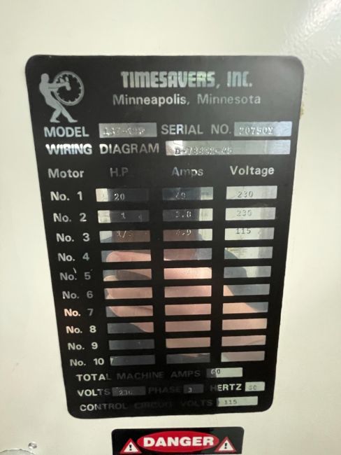 TIMESAVERS WIDEBELT SANDER, MODEL 137-1HP, SERIAL NO. 207501, LEESON MOTOR 20 HP, 1750 RPM, 208-230/460 V, MOTOR (NO. 2) 1 HP 230 V, MOTOR (NO. 3) 1/6 HP, 115 V, APPX WIDTH OF SANDPAPER BELT 36-3/4'', APPX DIMENSIONS OF CONVEYOR BELT 51''L x 36-3/4''W