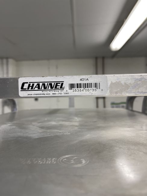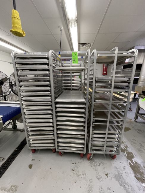 (5) CHANNEL ALUMINUM BAKING PAN RACK, MODEL 401A, INCLUDES APPROX. (105) BAKING SHEET PANS, MIX OF PERFORATED AND SOLID, RACKS TOTAL DIMS APPROX.: 20-1/2" W X 26" D X 70" H, INTERIOR DIMS APPROX.:18-1/2" W X 25-1/2" D, 1-2/" LIP, APPROX. 3" HEIGHT BETWEEN LIPS