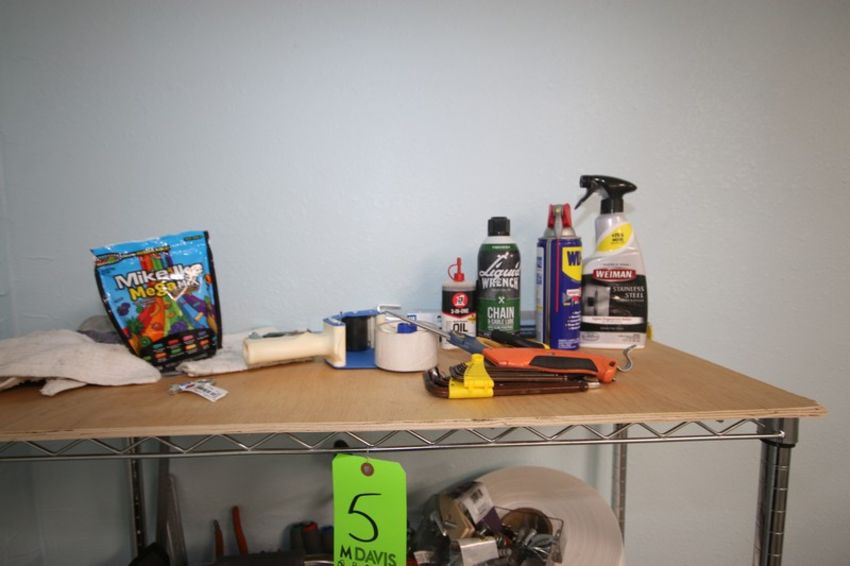 Rack of Toolig & Oils, Includes Hand Tools, Tool Box, Some Fittings, Chain Lube, & Other Present Contents (LOCATED IN LAS VEGAS, NV)