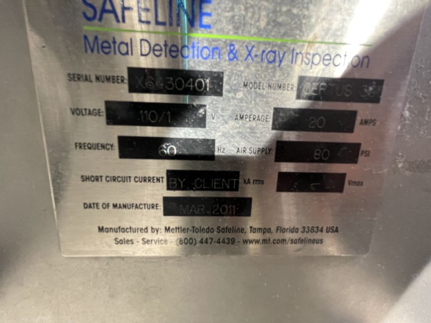 SAFELINE METTLER TOLEDO CONVEYORIZED X-RAY, MODEL CERTUS300, S/N X 6430401, 16" W X 8" H APERTURE, PORTABLE UNIT MOUNTED ON CASTERS, 110 V (RIGGING, LOADING, SITE MANAGEMENT FEE $300)