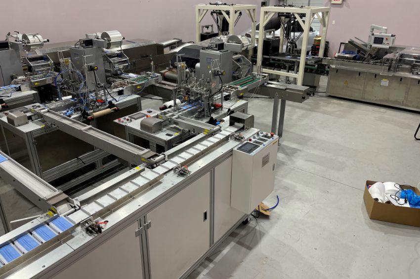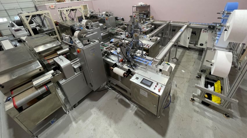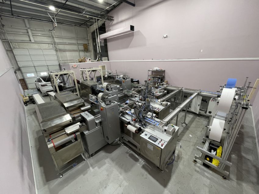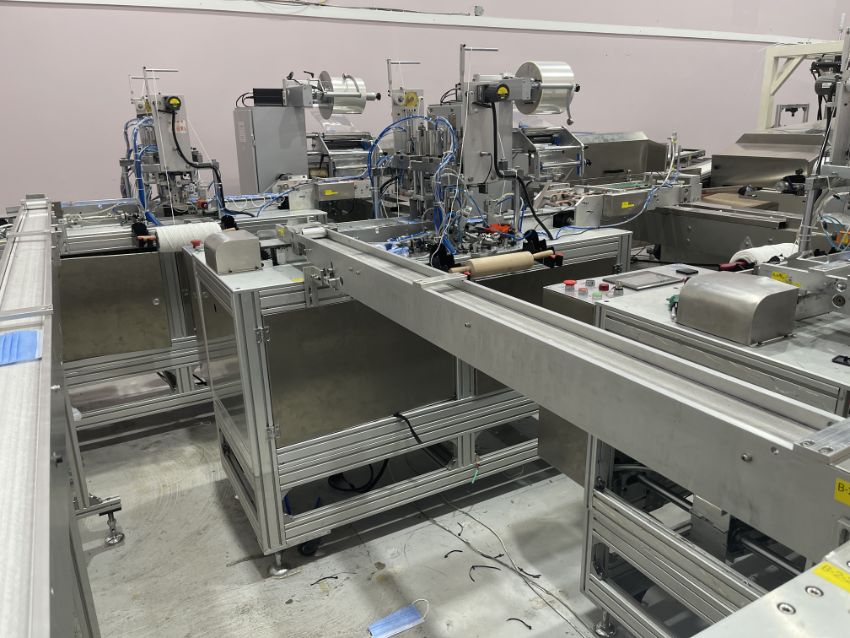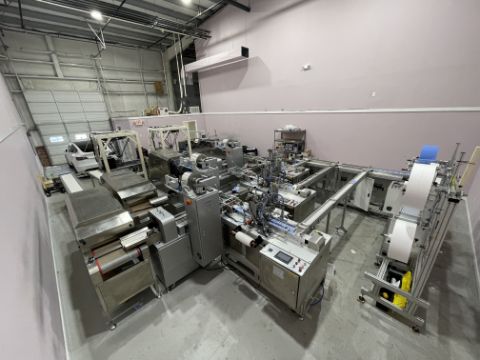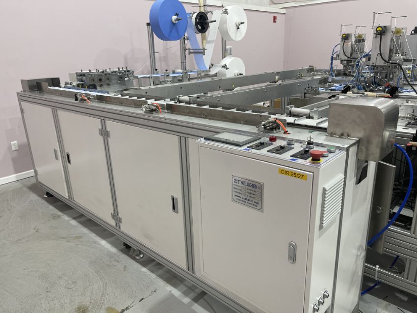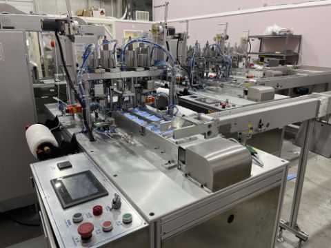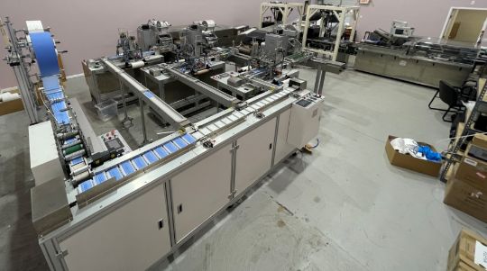 The mask making machine connects to a mould conveyor/distribution system. This system sends product to 3 separate ear loop welders. From here, the masks are individually wrapped by 3 plastic packing machines and then to 3 UV sterilizers. The three lines then combine into one large conveyor with 2 robotic arms. The arms take the finished masks to the finished product conveyor where the counted masks are retail boxed.