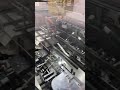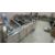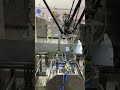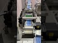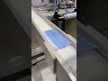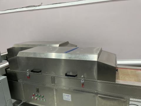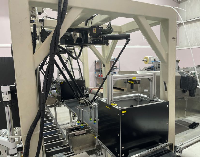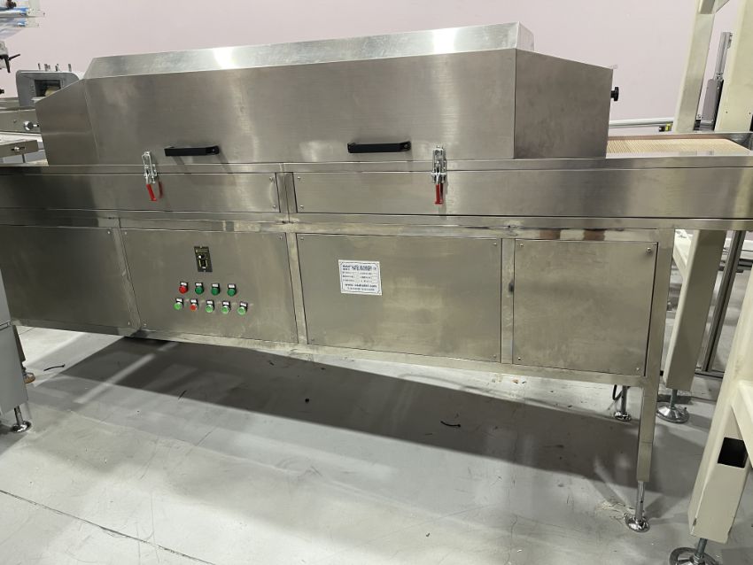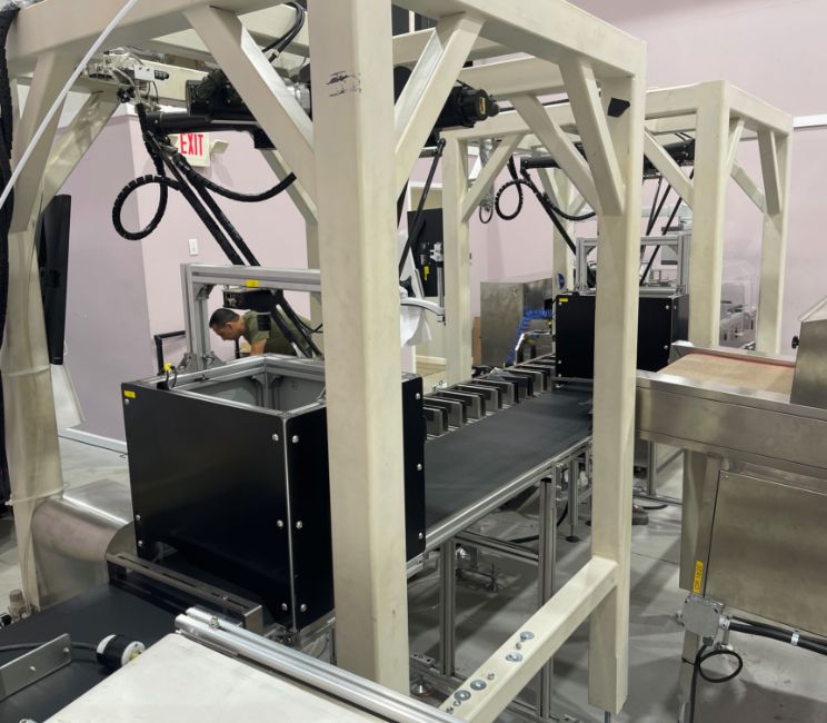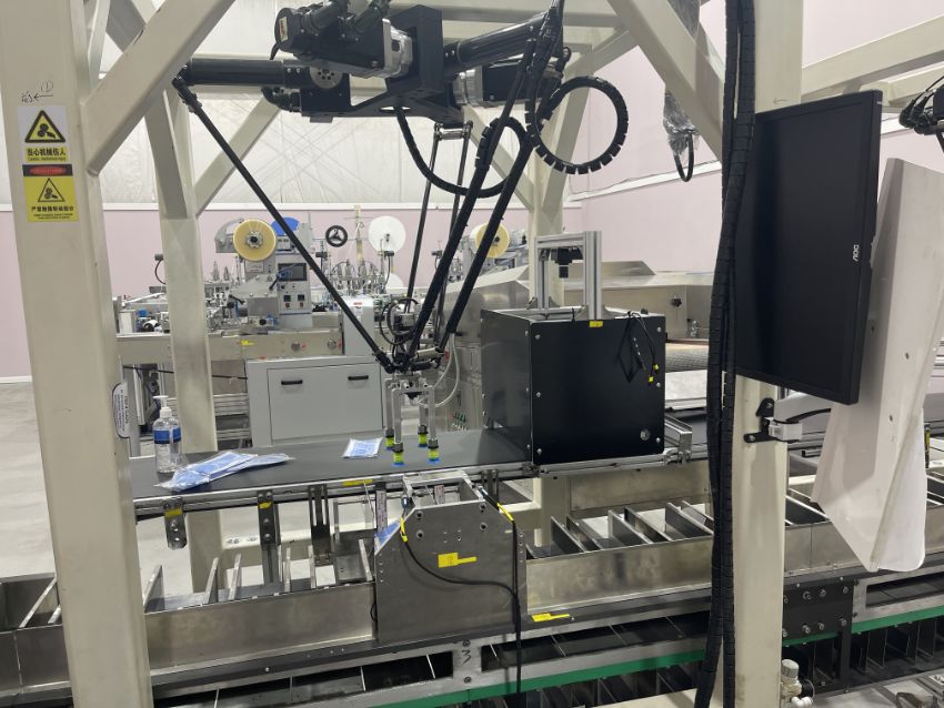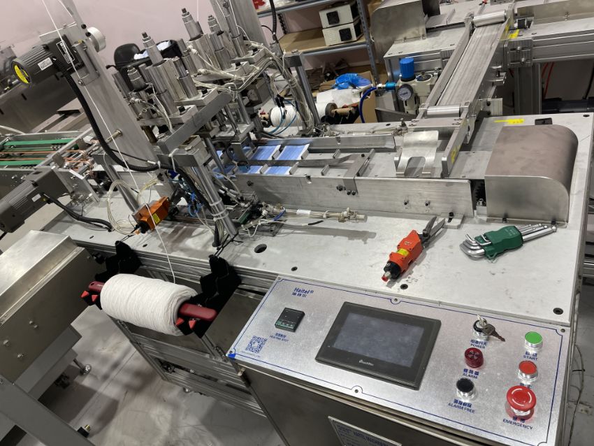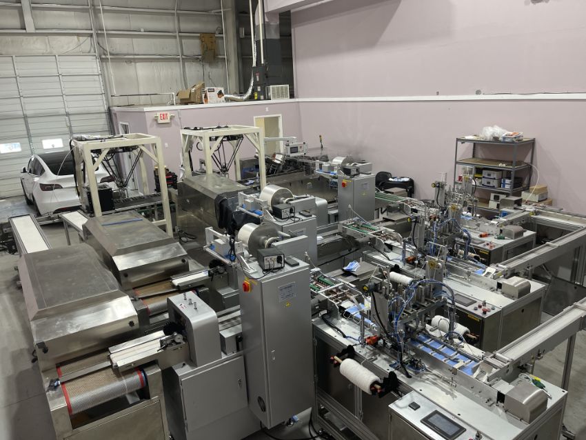 The mask making machine connects to a mould conveyor/distribution system. This system sends product to 3 separate ear loop welders. From here, the masks are individually wrapped by 3 plastic packing machines and then to 3 UV sterilizers. The three lines then combine into one large conveyor with 2 robotic arms. The arms take the finished masks to the finished product conveyor where the counted masks are retail boxed.