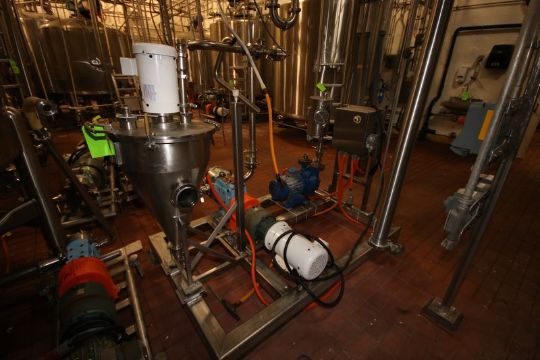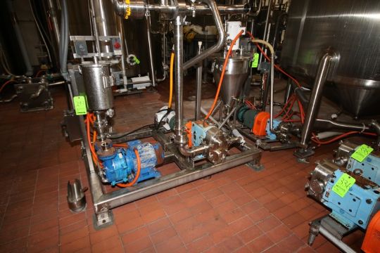 S/S Blending Skid, with Waukesha Cherry-Burrell Positive Displacement Pump, M/N 130, S/N 2119463R1, with Baldor 5 hp Motor, 208-230/460 Volts, 3 Phase, with Vacuum Pump, with S/S Funnel with Vertical S/S Agitation, 1755 RPM, Skid Mounted on Load Cells (INV#81209) (LOCATED @ MDG AUCTION SHOWROOM 2.0 IN MONROEVILLE, PA) (Handling, Loading & Site Management Fee: $1000)