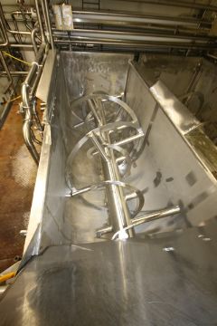 14,000 lb. S/S Ribbon Blender, S/N 64750-G3, Item 27 R.H. 71-21, with Reliance 100 hp Motor, 1785 RPM, 460 Volts, 3 Phase, Internal Blending Compartment Dims.: Aprox. 144" L x 60" W x 66" Deep, with Bottom Discharge, Overall Dims. of Blender: Aprox. 186" L x 67" W x 107" H, Mounted on S/S Legs (BLENDER 15) (INV#81306)(LOCATED IN CHAMPAIGN, IL) (Handling, Loading & Site Management Fee: $10,000)