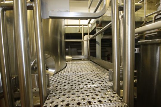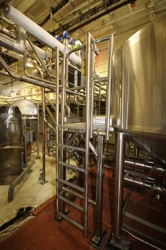 S/S Platform Surrounding (2) Feldmeir Tanks, with S/S Rails & (3) S/S Ladders, with (3) Safety Gates, Platform Aprox. 62" Tall (INV#81314)(LOCATED IN CHAMPAIGN, IL) (Handling, Loading & Site Management Fee: $2,500)