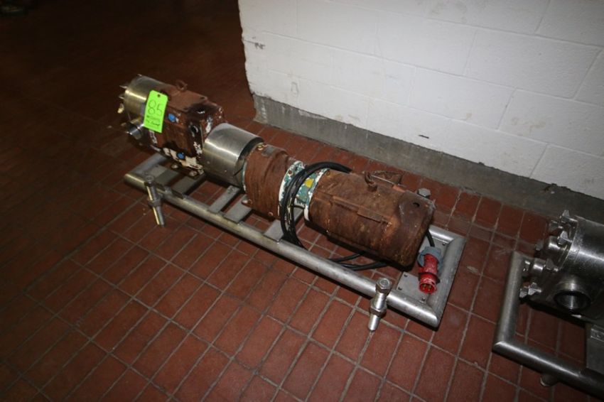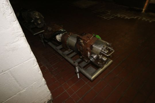 Waukesha Cherry Burrell 10 hp Positive Displacement Pump, M/N 130, S/N 425849 06, with Reliance 1755 RPM Motor, 230/460 Volts, 3 Phase, Aprox. 3" Clamp Type Inlet/Outlet, Mounted on S/S Frame (INV#81243) (LOCATED @ MDG AUCTION SHOWROOM 2.0 IN MONROEVILLE, PA)(Handling, Loading & Site Management Fee: $300)