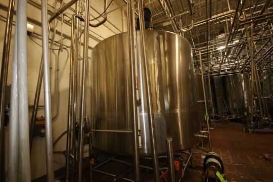 DCI 2,000 Gal. S/S Single Wall Tank, S/N 92-D-44569-A, with Dual CIP Spray Ball, Dome Top/Cone Bottom, Mounted on S/S Frame & Load Cells, with Fairbanks Digitial Read Out, Overall Height of Tank: Aprox. 140" H, with Top Mounted Agitation Motor, with S/S Man Ladder (INV#81176) (LOCATED @ MDG AUCTION SHOWROOM 2.0 IN MONROEVILLE, PA) (Handling, Loading & Site Management Fee: $2500)