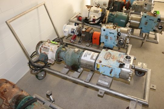 Waukesha 5 hp Positive Displacement Pump, with Reliance 1745 RPM Motor, 230/460 Volts, 3 Phase, with Aprox. 2-1/2" Clamp Type Inlet/Outlet, Mounted on Portable S/S Frame (INV#81224) (LOCATED @ MDG AUCTION SHOWROOM 2.0 IN MONROEVILLE, PA)(Handling, Loading & Site Management Fee: $300)
