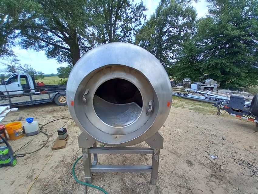 800 lbs. S/S Tumbler, with Motor, Mounted on S/S Frame (NOTE: Missing Gear Cover) (Handling, Loading, & Site Management Fee: $250.00 USD) (LOCATED IN MT. VERNON, TX)