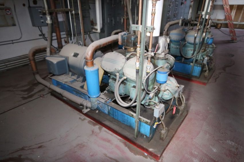 COMPLETE GLYCOL REFRIGERATION SYSTEM: Includes--(1) Genuine Carlyle 125 hp 8-Piston Freon Compressor, M/N 5H80-A219, with Lincoln 1770 RPM Motor, 230/460 Volts, 3 Phase, with Furnas Soft Starter; (1) Genuine Carlyle 125 hp 8-Piston Freon Compressor, M/N 5H80-A219, with Lincoln 1782 RPM Motor, 230/460 Volts, 3 Phase, with Furnas Soft Starter; (1) Genuine Carlyle 125 hp 8-Piston Freon Compressor, M/N 5H80-A219, with Lincoln 1770 RPM Motor, 230/460 Volts, 3 Phase, with Furnas Soft Starter; (1) Vertical Refrigeration Vales Freon Accumulation System, NAT'L BD: #2197, MAWP 50 PSI @ 300 F, -20 F @ 150 PSI; (1) Horizontal RSD Freon Receiver Tank, Previously Received R407F; BAC Evaporator Unit, M/N VLG-225A, S/N 78-8914M, Belt No. 4-B90; (1) 2011 Frick 3-Fan Evaporator, S/N 300/620116.0003, 460 Volts, 3 Phase, Pro. #: 507281 (1) 2011 Frick 3-Fan Evaporator, 460 Volts, 3 Phase (1) 2011 Frick 3-Fan Evaporator, 460 Volts, 3 Phase, (Handling, Loading, & Site Management Fee: TBA USD) (LOCATED IN STOCKTON, CA)