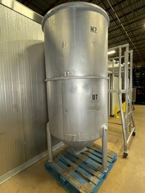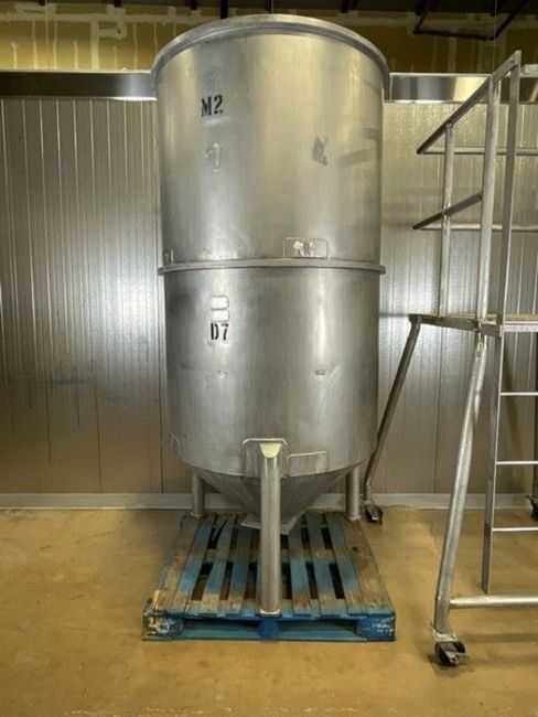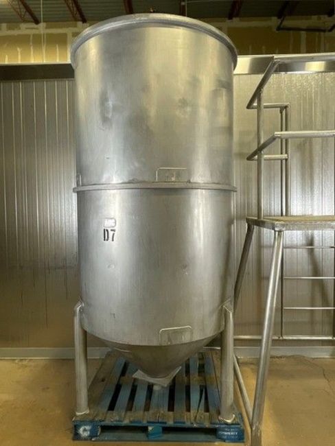 700 Gal. Single Wall S/S Tank, with Aprox. 2.5" Sanitary Outlet, with Conical Bottom (Auction ID 96e3f4ed) (Handling, Loading, & Site Management Fee: $150.00 USD) (LOCATED IN SAN ANTONIO, TX)