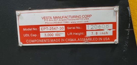 3,000 lbs. Vestil Electric Pallet Jack Model # EPT-2547-30 Serial # 120608 (Handling, Loading, & Site Management Fee: $100.00 USD) (LOCATED IN MECHANICSVILLE, VA)