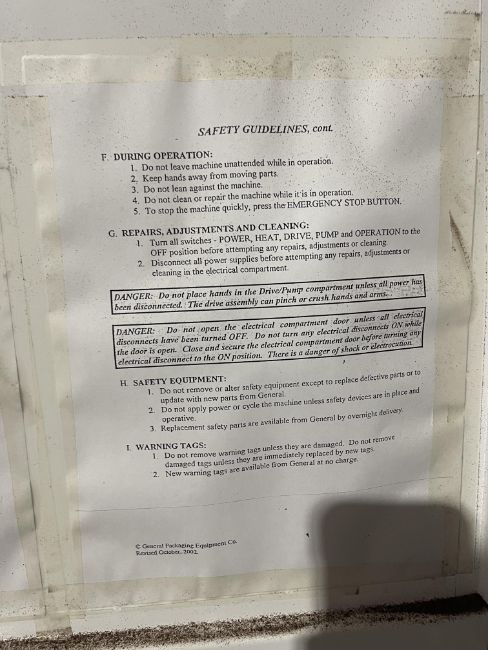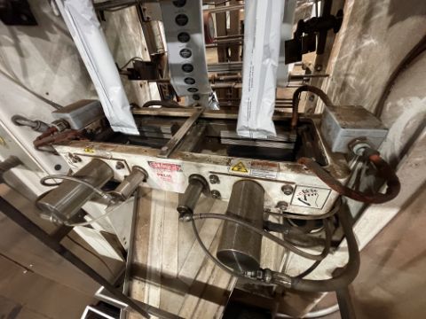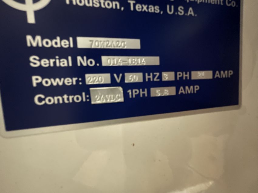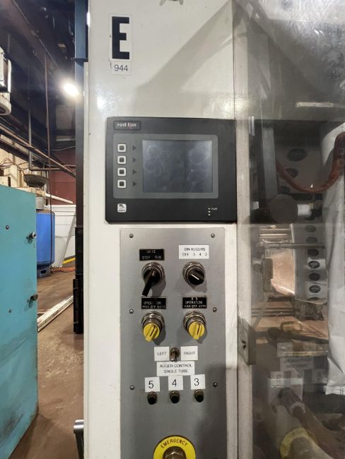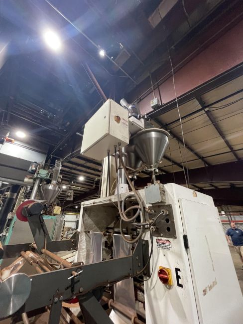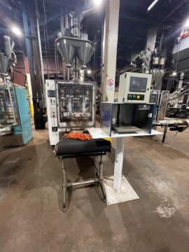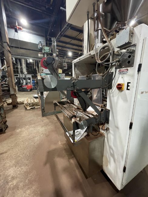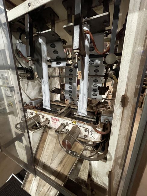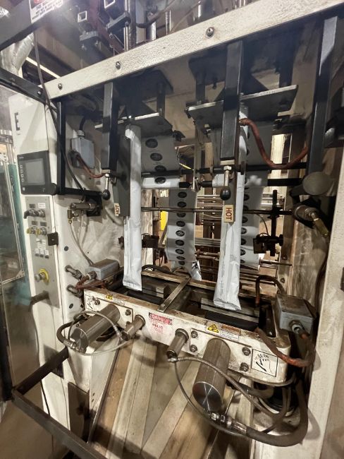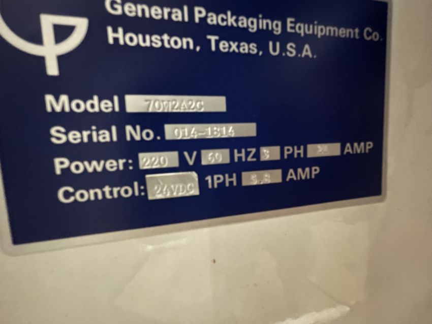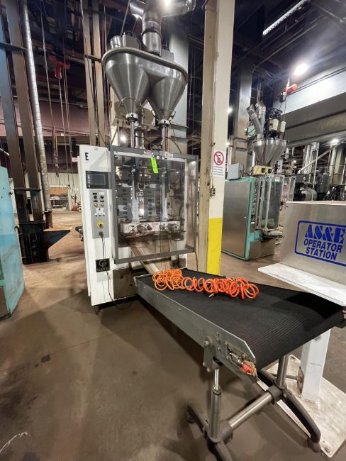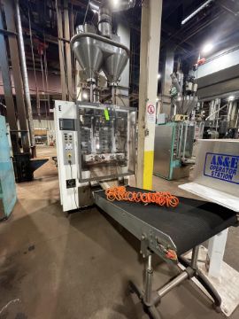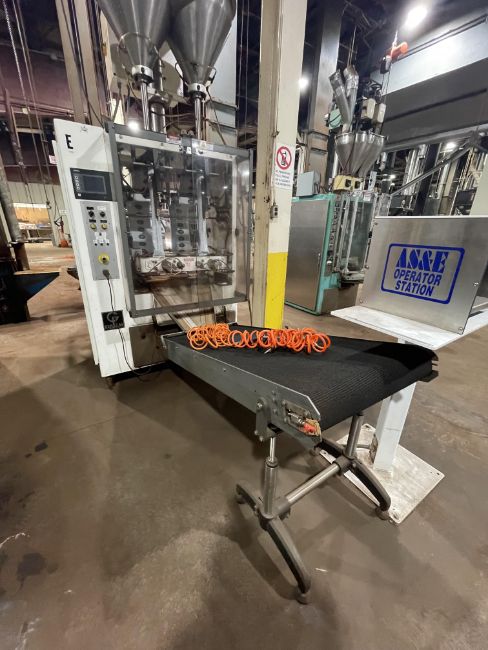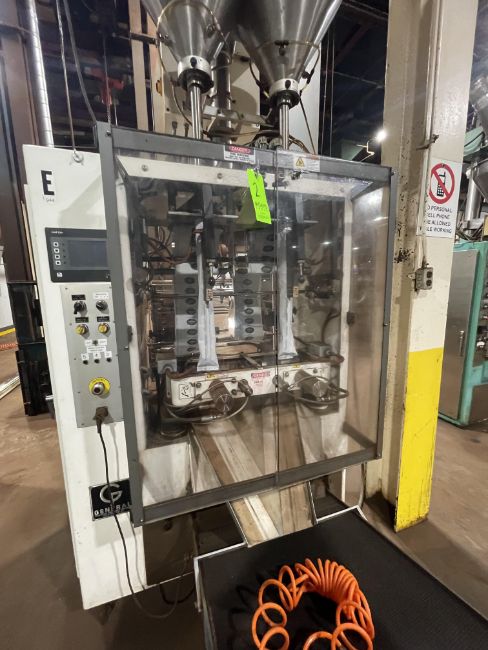 GENERAL PACKAGING EQUIPMENT COMPANY VERTICAL FORM FILL AND SEAL FILLER (VFFS), MODEL 70W2A2C, S/N 014-1814,SETUP WITH (2) AS&E (AUTOMATION SUPPLY AND ENGINEERING) AUGER FILLERS, MODEL M50 DUAL AUGER FILLER, S/N 1764; 2015-0120 INCLINE OUTFEED CONVEYOR APPROX. 72" L X 26" W X 36" H, REPORTEDLY RAN UP TO 144 BPM (BAGS PER MINUTE), LARGEST RUNNING BAG PREVIOUSLY 1-1/2 OZ TO 2-1/2 OZ FRAC PAKS, FILM IS 9.125 WIDTH FILM, 6" MAXIMUM STROKE LENGTH, (2) APPROX. 9" SEAL BAR SECTIONS, SINGLE DOOR CONTROL CABINET WITH ASSORTED VFDS, AS&E S/S PLATFORM SCALE, APPROX. 12-1/2" L X 13" W PLATFORM, REDLION HMI, OPERATES IN CONJUNCTION WITH AS&E FILLER TO ENSURE ACCURATE FILL WEIGHT, 220 V, 3 PHASE