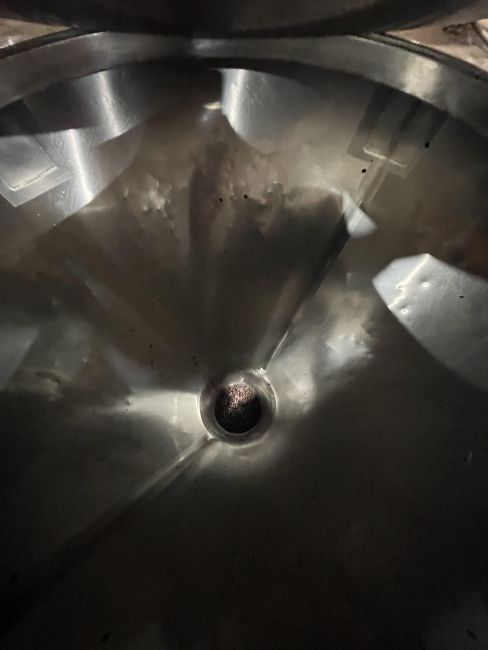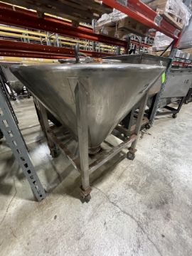 S/S PORTABLE CONE-BOTTOME TOTE / BIN, APPROX. 52" DIA X 46" TO BOTTOM OF CONE, APPROX. 52" OVERALL HEIGHT, MOUNTED ON CASTERS, WITH GATE VALVE